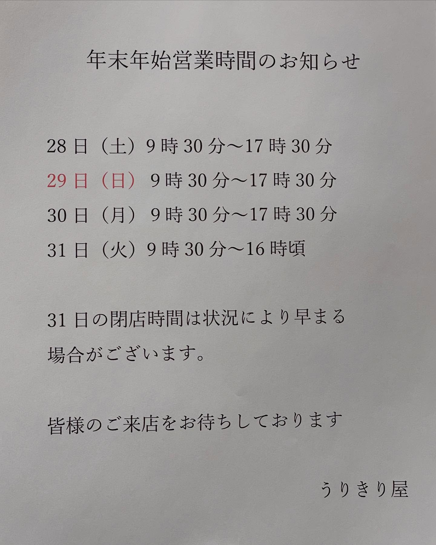 年末は31日夕方4時頃(状況によって早まるかもしれませんが)まで営業いたします