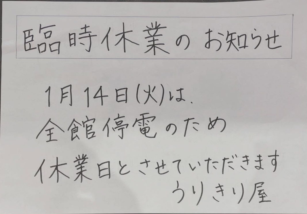 1月14日(火)は、電気設備法令点検に伴い全館休館となります