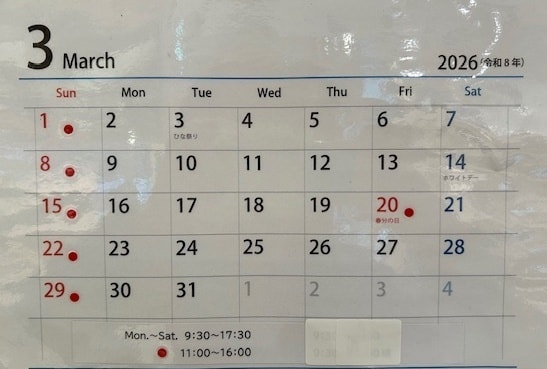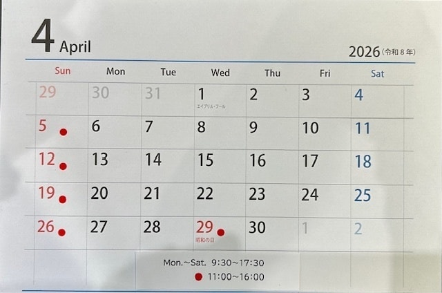 - いつもご利用いただきありがとうございます。店舗移転準備の為、当面の間日曜、祝日をお休みさせていただきます。平日 10:00~17:30日、祝日 休みご不便ををお掛け致しますが、何卒ご理解、ご了承のほどお願い申し上げます。